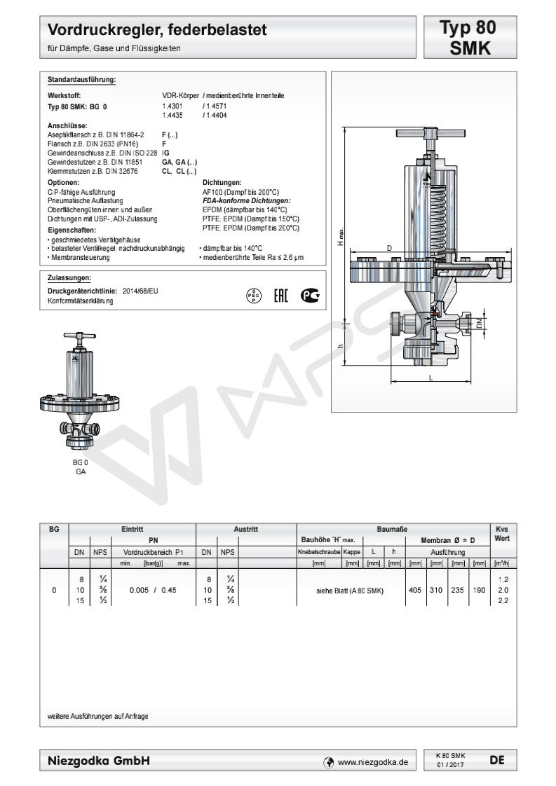 | Typ 80 SMK德國Niezgodka進(jìn)口衛(wèi)生級壓力控制閥的各項(xiàng)技術(shù)參數(shù) |